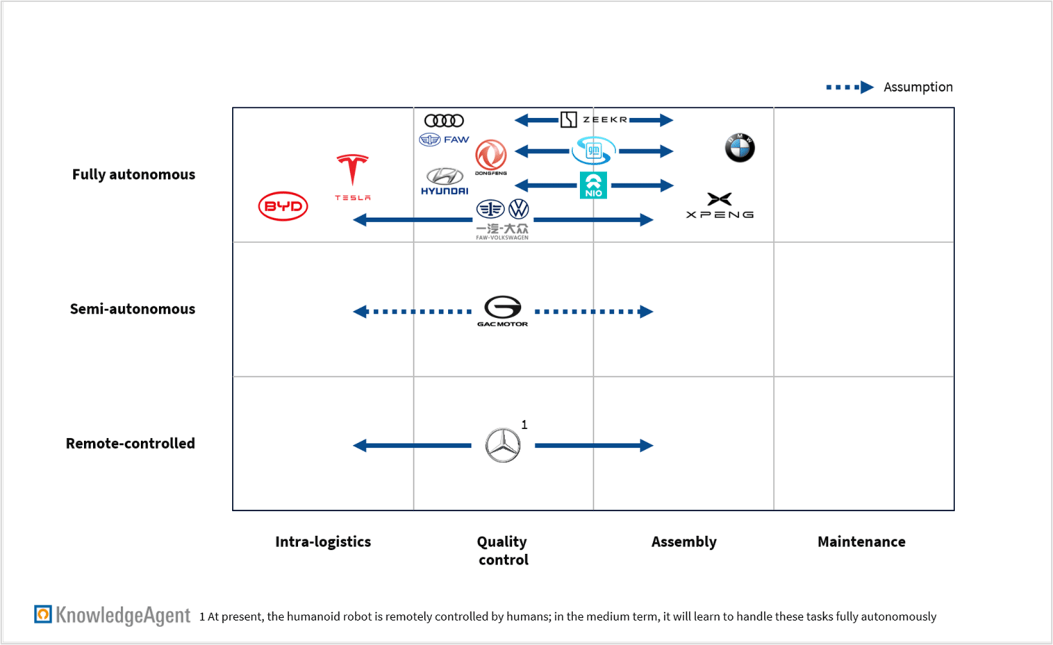 Other OEMs like Great Wall Motors and ChangAn have announced humanoid initiatives, although neither company has deployed humanoids in production yet.