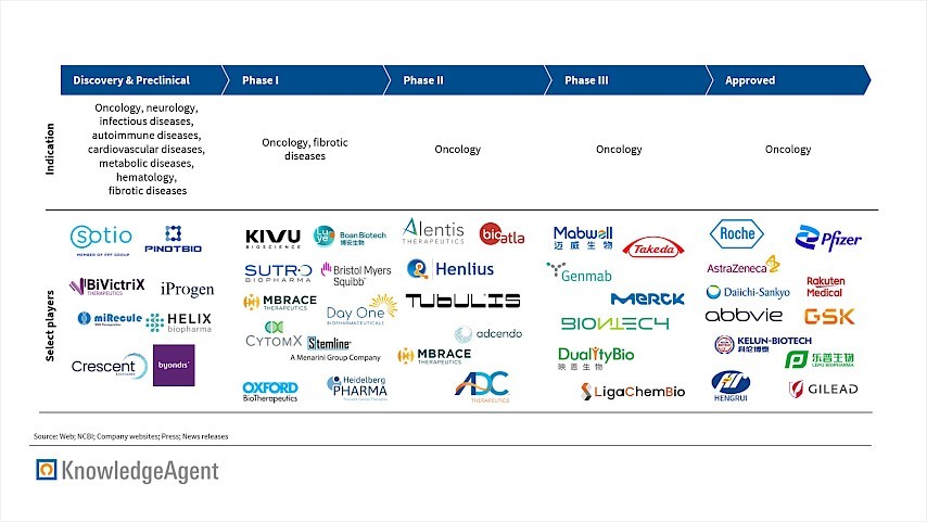 Kelun Biotech launched Jiataile in December 2024 and Trastuzumab Botidotin in October 2025. It is closely followed by Jiangsu Hengrui and Lepu, which also recorded successful launches in China in 2025. At the same time, smaller Western innovators such as Tubulis are addressing bottlenecks in linker stability, conjugation precision, and manufacturability. Together, these dynamics point to a more fragmented and competitive innovation environment, even as commercial revenues remain concentrated. The player landscape remains full (see Figure 2), with earlier phase players starting to explore ADCs in indications beyond oncology, including for example in the autoimmune, neurology or fibrotic diseases fields.