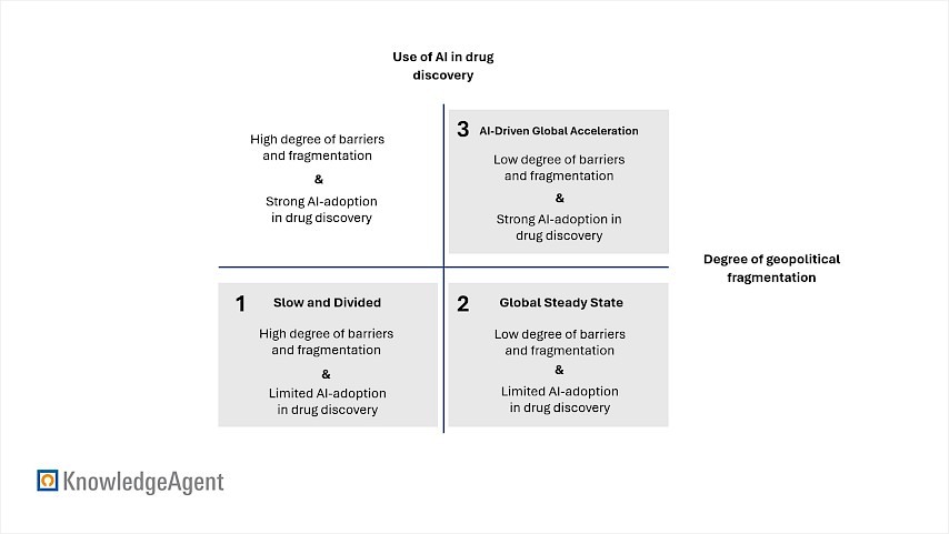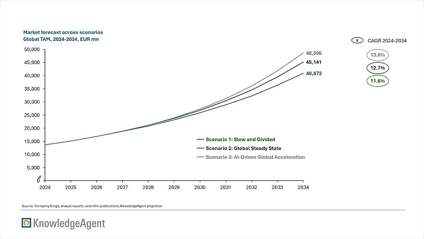Our modeling projects three distinct trajectories through 2034. In our conservative "Slow and Divided" scenario, geopolitical fragmentation disrupts supply chains and constrains capacity. Yet, even with these headwinds, strong clinical demand drives the market to USD 40.9 bn, representing a CAGR of 11.6%. In our baseline "Global Steady State" scenario, fundamentals such as aging demographics and pipeline maturity propel the market to USD 45.1 bn at a 12.7% CAGR. Finally, the optimistic "AI-Driven Global Acceleration" scenario assumes that artificial intelligence successfully drives drug discovery outcomes, while the geopolitical outlook remains stable. This outlook yields to a market of USD 48.6 bn at a 13.6% CAGR, highlighting the potential value unlock from AI-driven drug discovery methods. An overview of the three market forecasts across the scenarios is provided in figure 4.