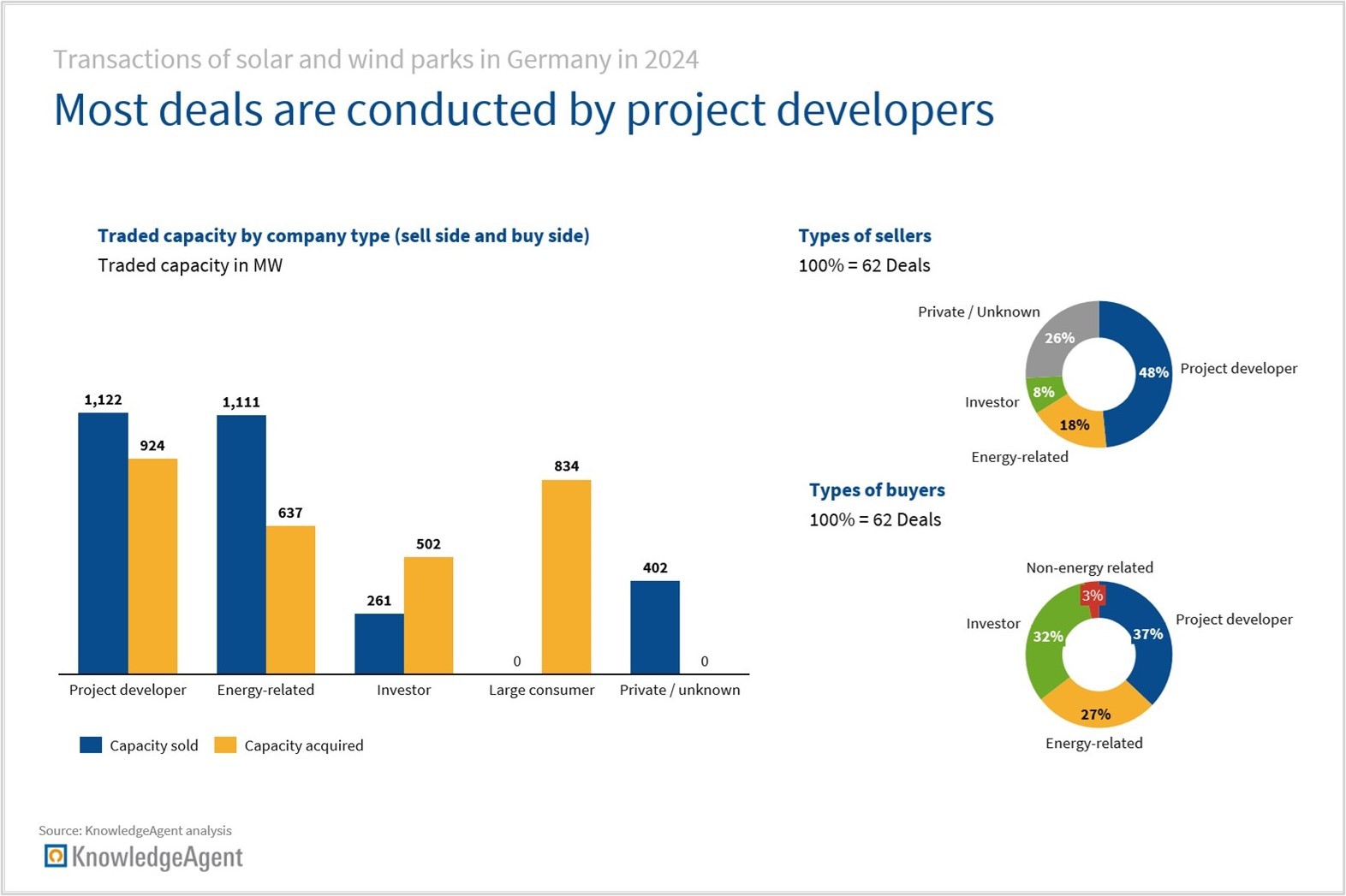 - On both sell- and buy-side most companies involved are project developers. Project developers are also responsible for most of the traded capacity. Other trading partners are energy companies and investors. On the sell-side, a considerable number of deals and traded capacity comes from private and/or anonymous owners.